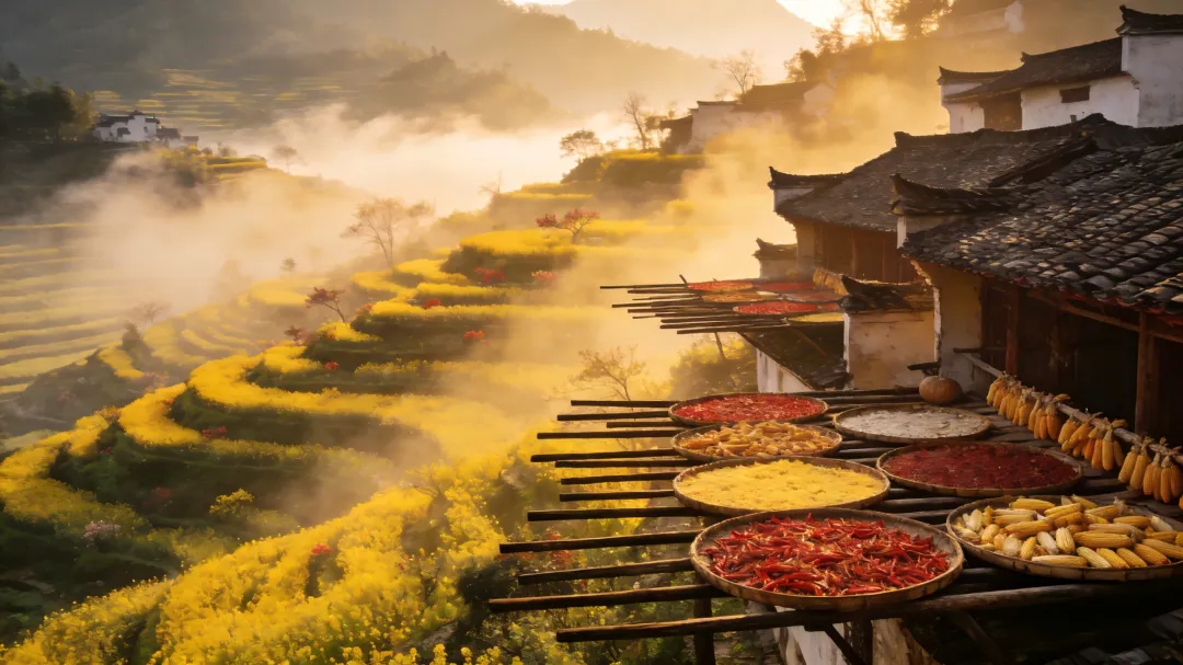 亮点:篁岭是婺源赏花天花板,梯田层层叠叠铺满金黄油菜花,搭配晒秋人家的红辣椒、黄玉米,形成独一无二的“花海晒秋”奇景,随手一拍都是田园大片。