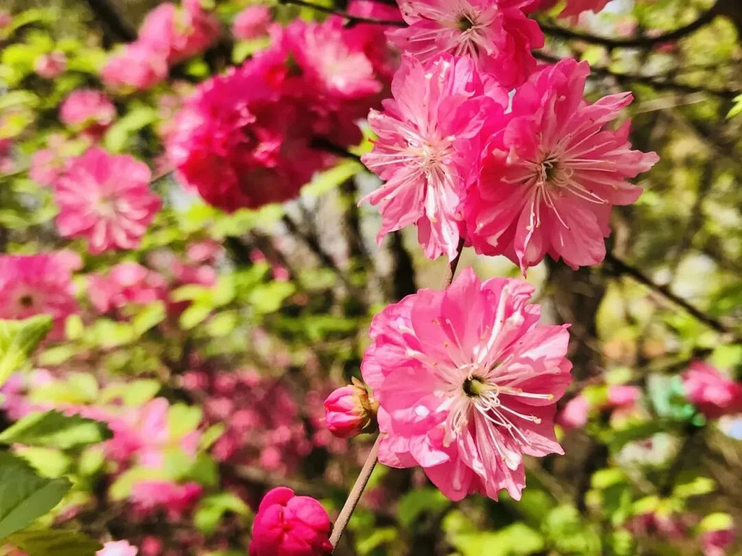榆叶梅繁英叠锦,粉黛盈枝,桃姿梅韵,艳若云霞,于庭院、路旁、坡前次第绽放,一树嫣红,绘就最动人的烂漫景致。