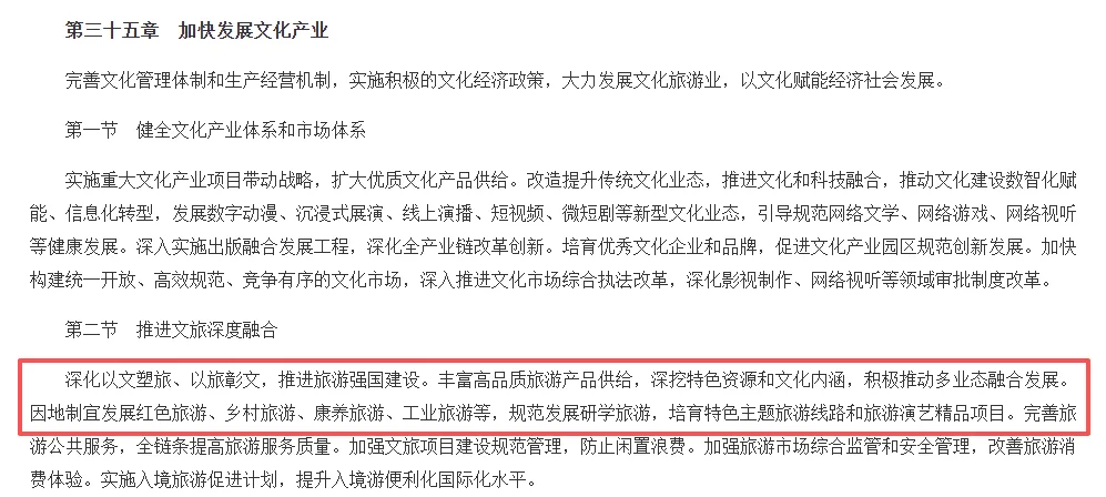 3月13日,《中华人民共和国国民经济和社会发展第十五个五年规划纲要》正式发布,明确指出:“因地制宜发展红色旅游、乡村旅游、康养旅游、工业旅游等,规范发展研学旅游,培育特色主题旅游线路和旅游演艺精品项目。”