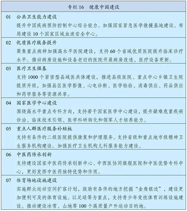推动中医药振兴发展,促进中西医结合。健全中医药服务体系,提升基层中医药服务能力,加强中医优势专科建设,发展中西医协同服务。促进中医药科技创新,实施中医药特色人才培养工程。加强中药资源保护利用和道地药材生产基地建设,加强中药制剂、经典名方发掘转化,提高中药质量,做大做强中医药产业。推进符合中医药特点的医保支付方式改革。弘扬中医药文化,推动中医药走向世界。
