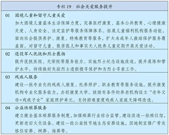 统筹规划养老服务设施布局,优化基本养老服务供给,推动养老服务扩容提质增效。深化养老服务改革发展,有序推进养老机构分类改革。发展社区嵌入式养老服务,培育专业化、品牌化、连锁化社区养老服务机构。发展家庭养老床位,推进居家适老化改造。发展互助性养老服务。健全失能失智老年人照护体系,增加养老机构护理型床位供给,积极推进医养结合。推行长期护理保险,健全统一的老年人能力评估制度。推进养老服务人员队伍职业化建设,提升养老服务综合监管质效。加强高龄独居老人和空巢老人关爱帮扶。