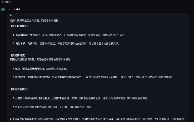 运行本地测试 测试结果如下: 问题1:我在深圳,有10天假期,想去贵州游玩,请推荐几个景点,顺便安排下行程