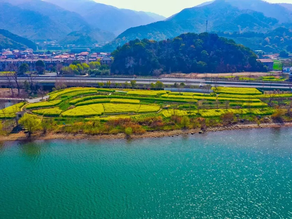 这片江畔花海地处三江汇合之地,是黄公望落笔《富春山居图》的卷首取景地,金黄花田与澄澈江水、黛色远山相映成画,古村烟火点缀其间,一步一景皆是江南田园的温柔。