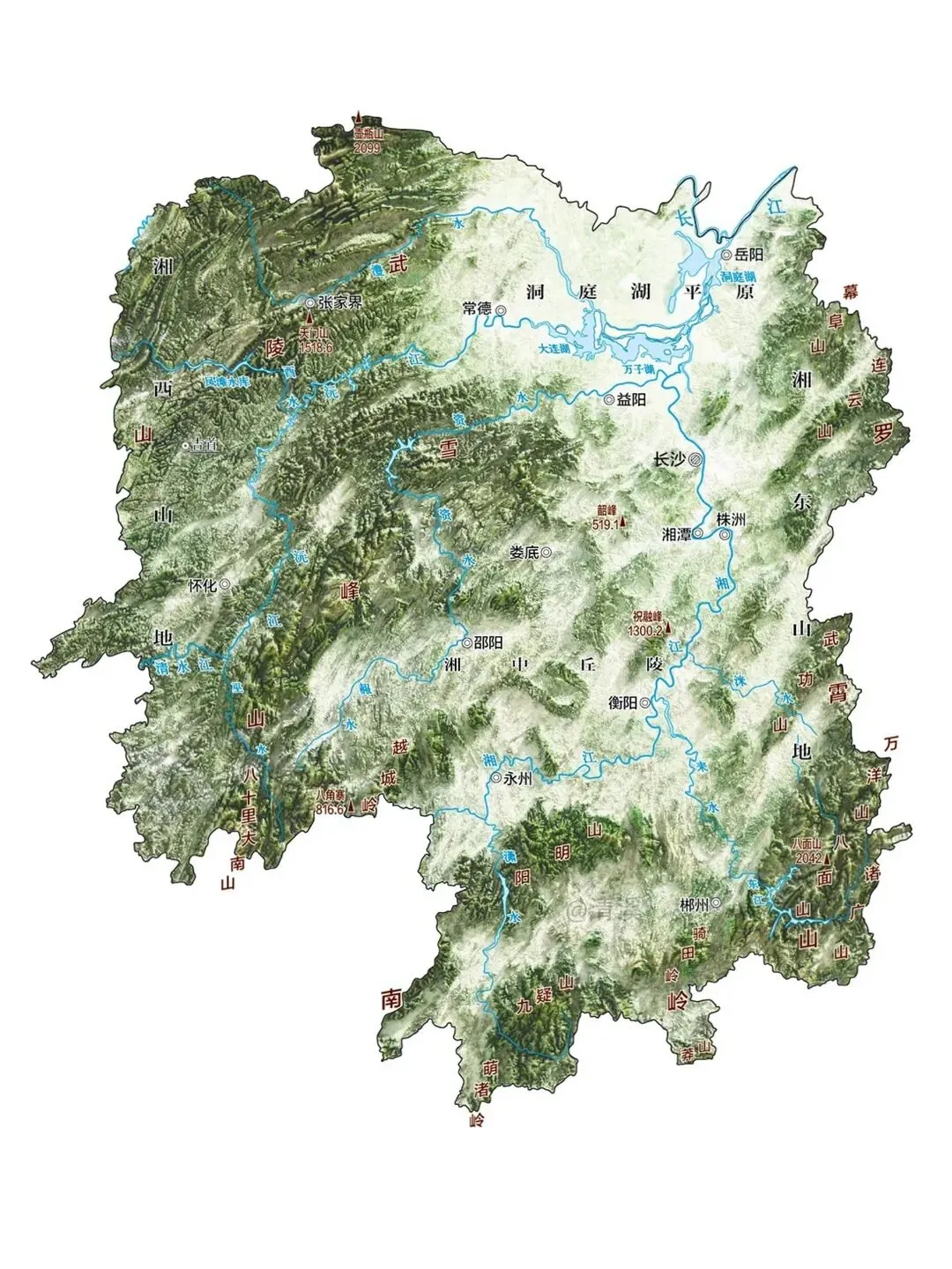 湖南东临江西,西接重庆、贵州,南毗广东、广西,北连湖北,地势呈三面环山、朝北开口的马蹄形地貌。这片马蹄形地貌中,便是面积两千余平方公里的中国第二大淡水湖——洞庭湖。
