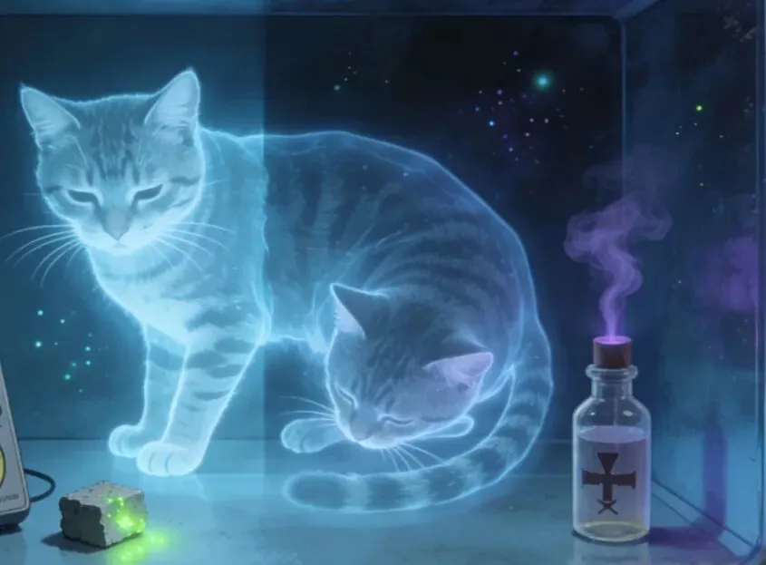 就像薛定谔的猫,在测量前它处于"既死又活"的叠加态,测量的瞬间宇宙就会分裂成两个:一个宇宙里猫活着,另一个宇宙里猫死亡。
