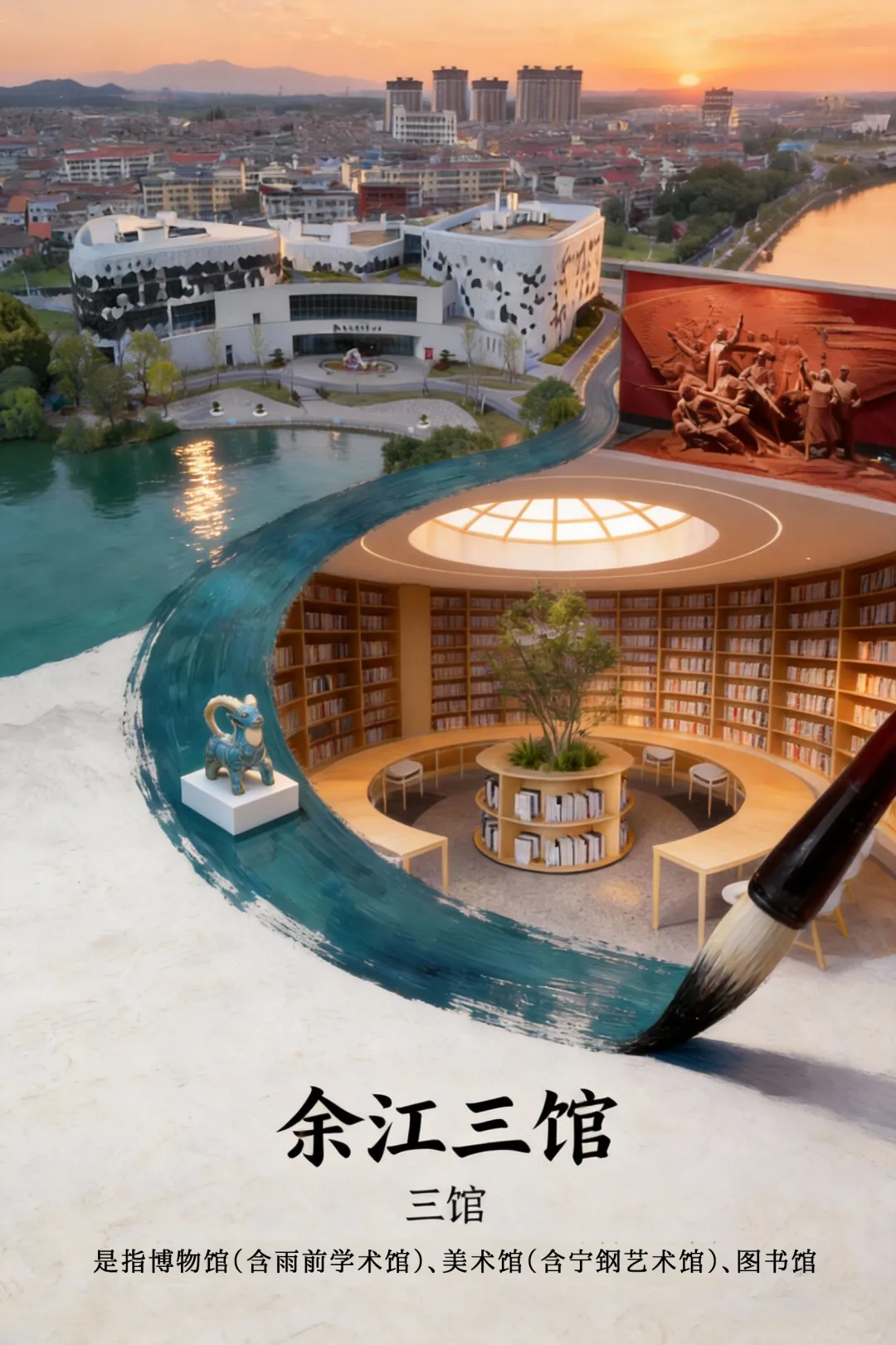 余江博物馆、美术馆、图书馆三馆合一,坐落于县城中心广场,临白塔河、伴人工湖喷泉,雨天来此,一站式感受文化、艺术与阅读的三重美好。