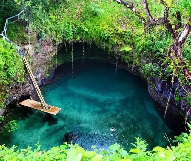 在萨摩亚呢,最热的景点应该属心形海沟了,它坐落在乌波卢岛南部的Lotofaga村里,被绿色植物环绕着,你可以顺着一行木梯下到水面上,零距离感受这因火山喷发而留下的美妙景观。
