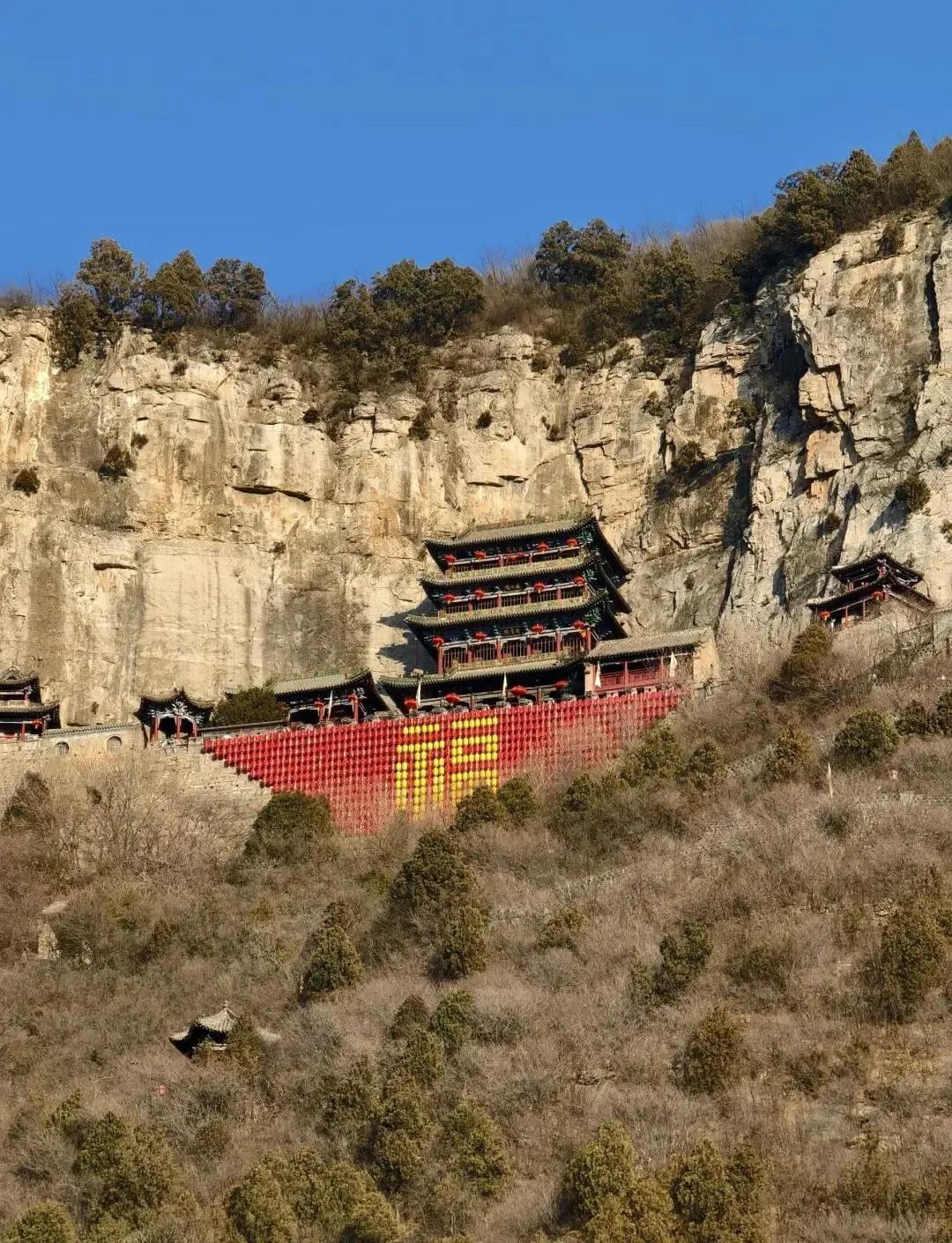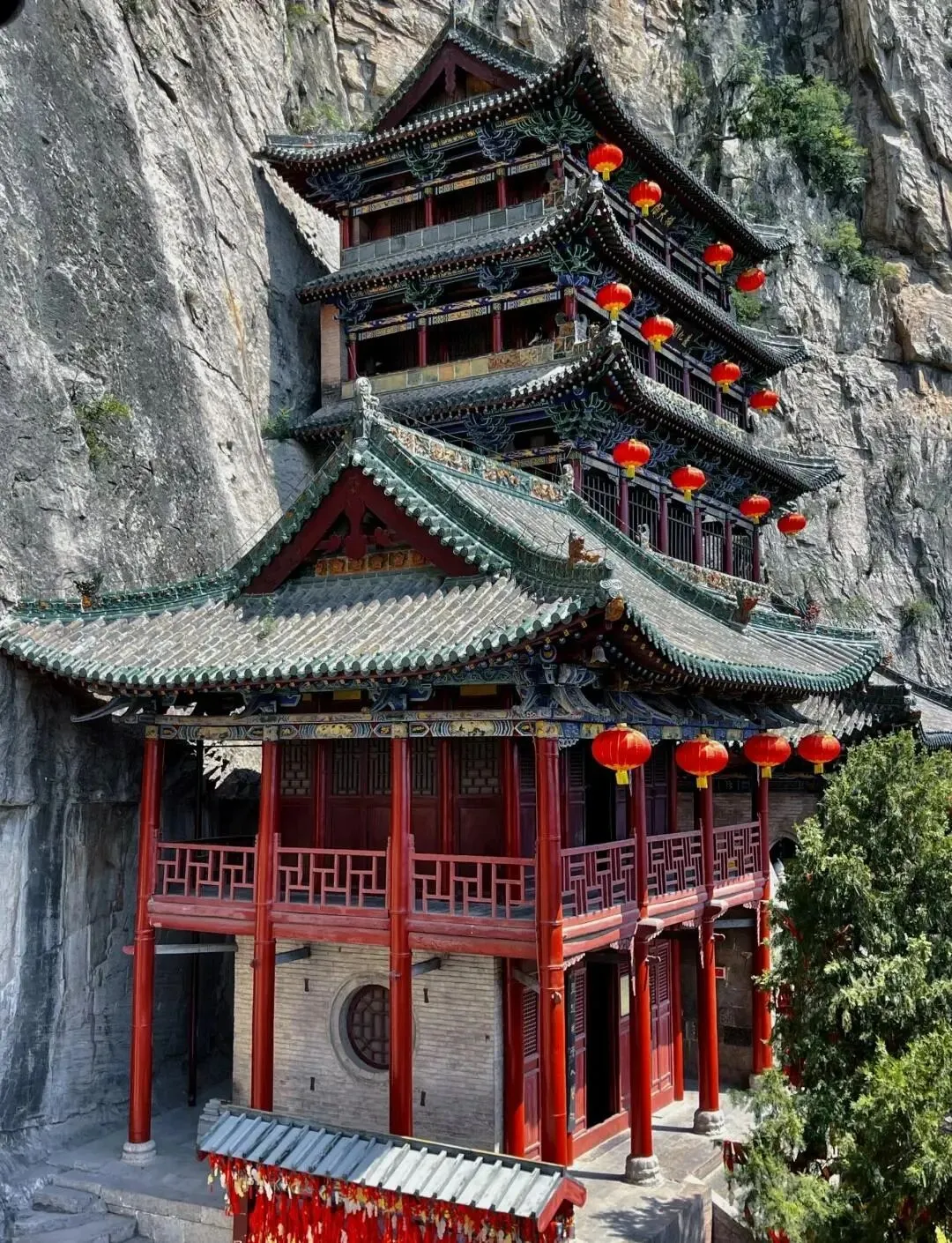 这座三层楼阁(清虚阁、造化阁、补天阁)通高23米,背倚绝壁,仅以九根粗大铁索系于崖壁的八个“栓马鼻”上,形成“上五下四”的独特布局。