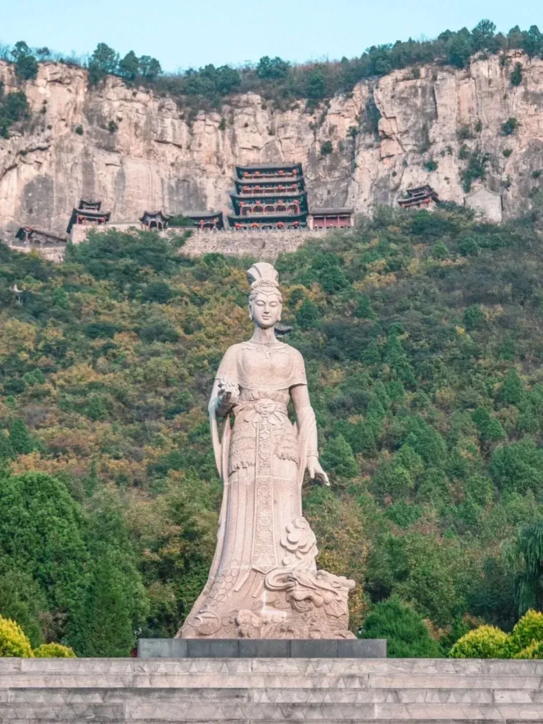 沿着著名的十八盘石阶攀登,核心建筑娲皇阁逐渐显露其惊世容颜。