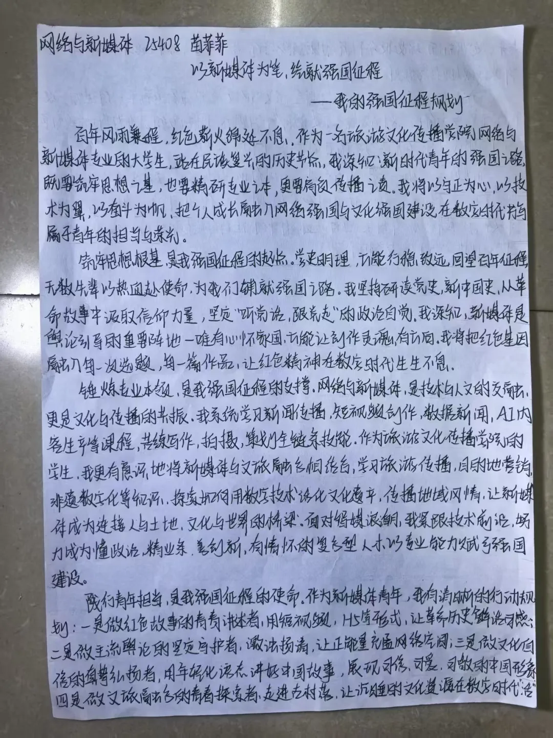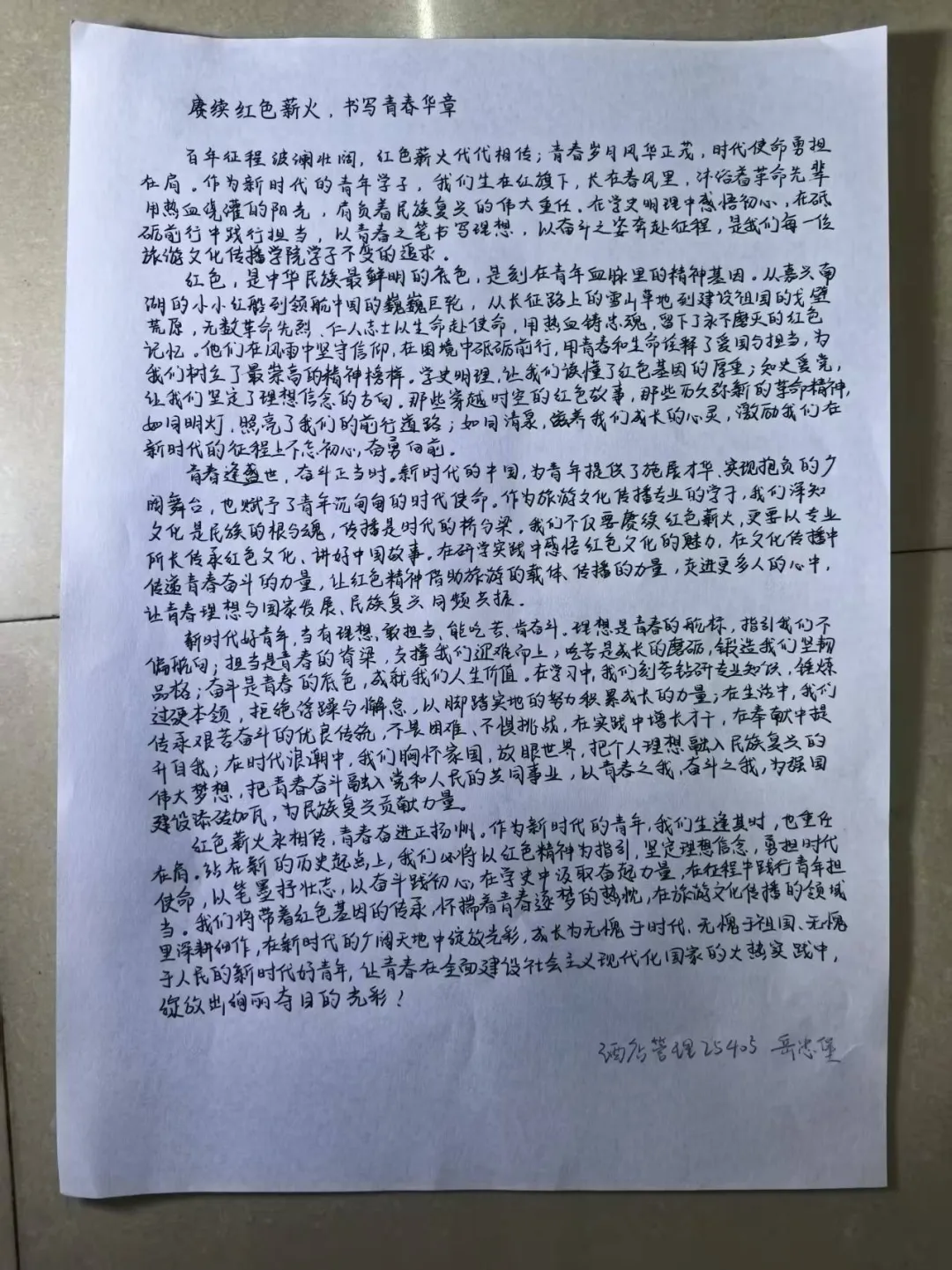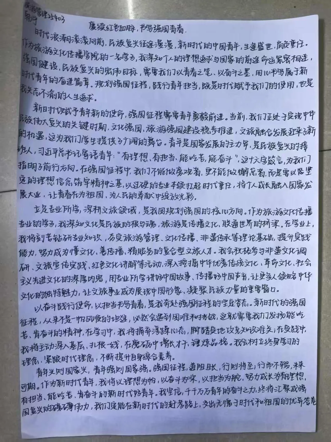 为引导学生赓续红色薪火、勇担时代使命,以文字抒发青春理想、坚定奋斗信念,激励学生在学史明理中汲取奋进力量,在规划征程中践行青年担当,成长为有理想、敢担当、能吃苦、肯奋斗的新时代好青年,旅游文化传播学院于3月18日特举办“我的强国征程规划”主题征文比赛。此次活动吸引了学生积极响应、踊跃投稿。同学们通过文字表达对革命先烈的崇敬之情,展现了新时代青年的历史担当。
