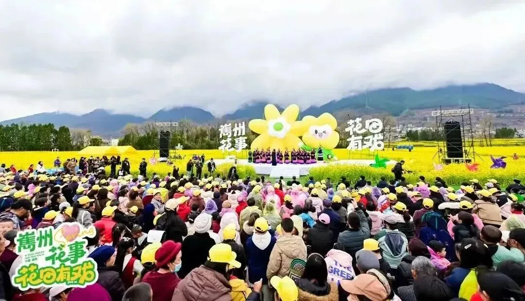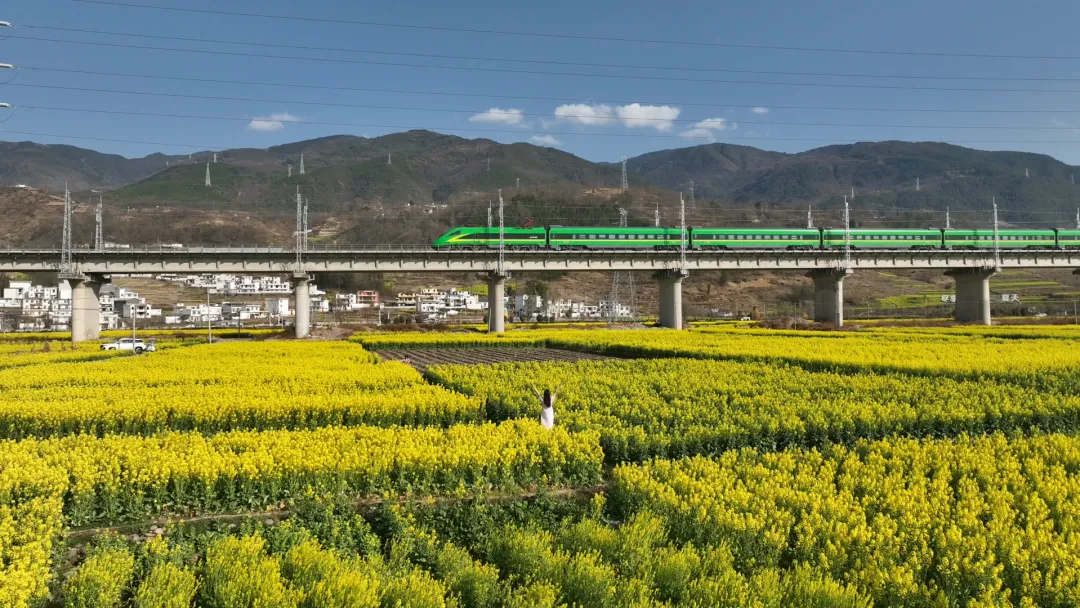 越西县大瑞镇,万亩油菜花铺就成一片鎏金花海,风过处,花浪轻涌,与成昆铁路上穿梭的列车、错落有致的乡村民居相映成趣。
