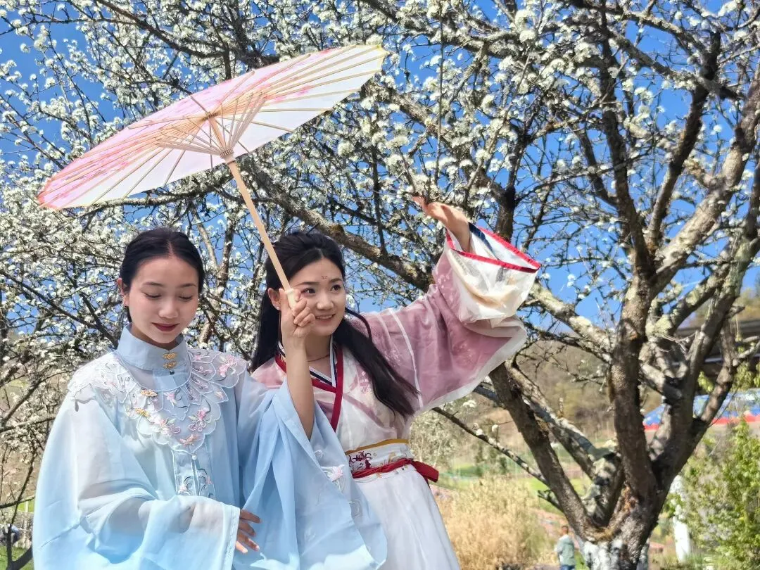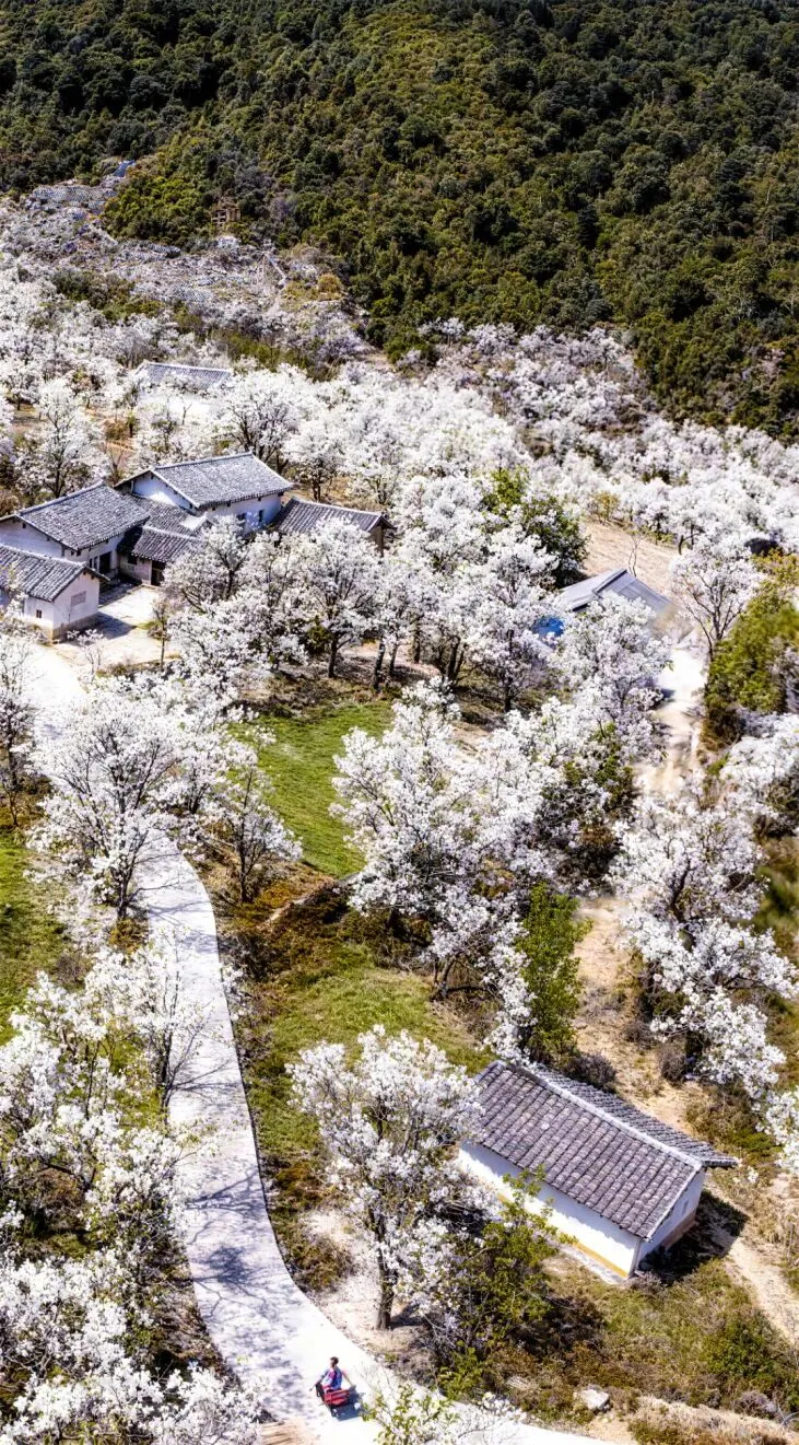 甘洛县团结乡瓦姑录村,漫山梨花似雪覆坡,与错落的彝家村寨勾勒出一幅水墨画卷。