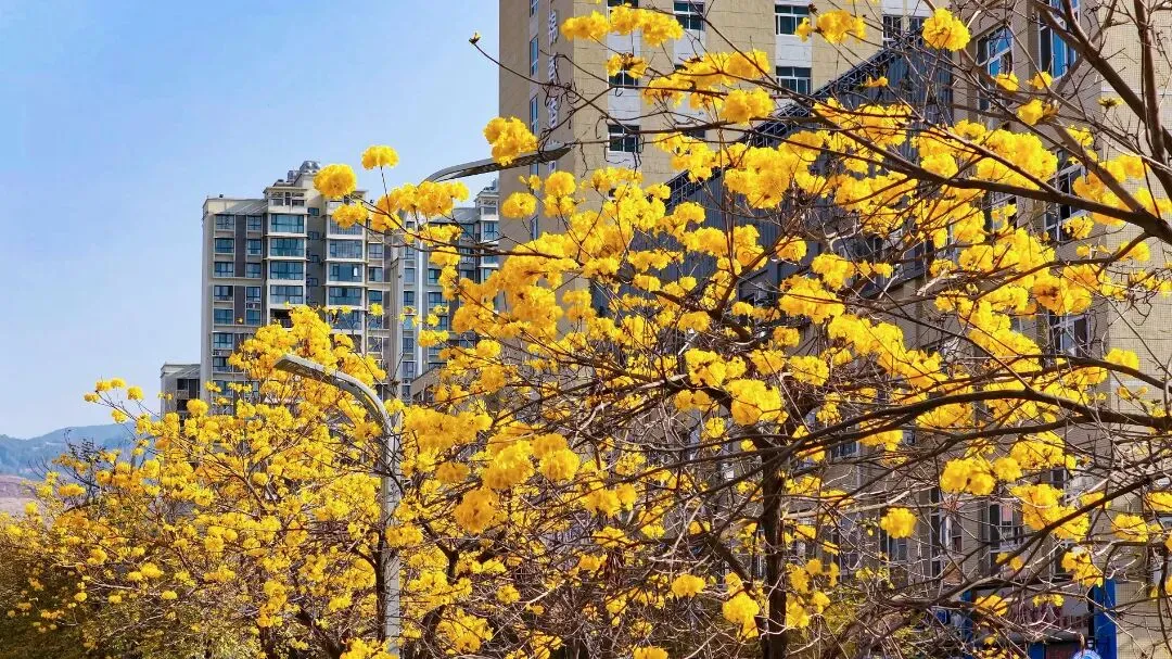 月海路黄花风铃木缀成鎏金小径。