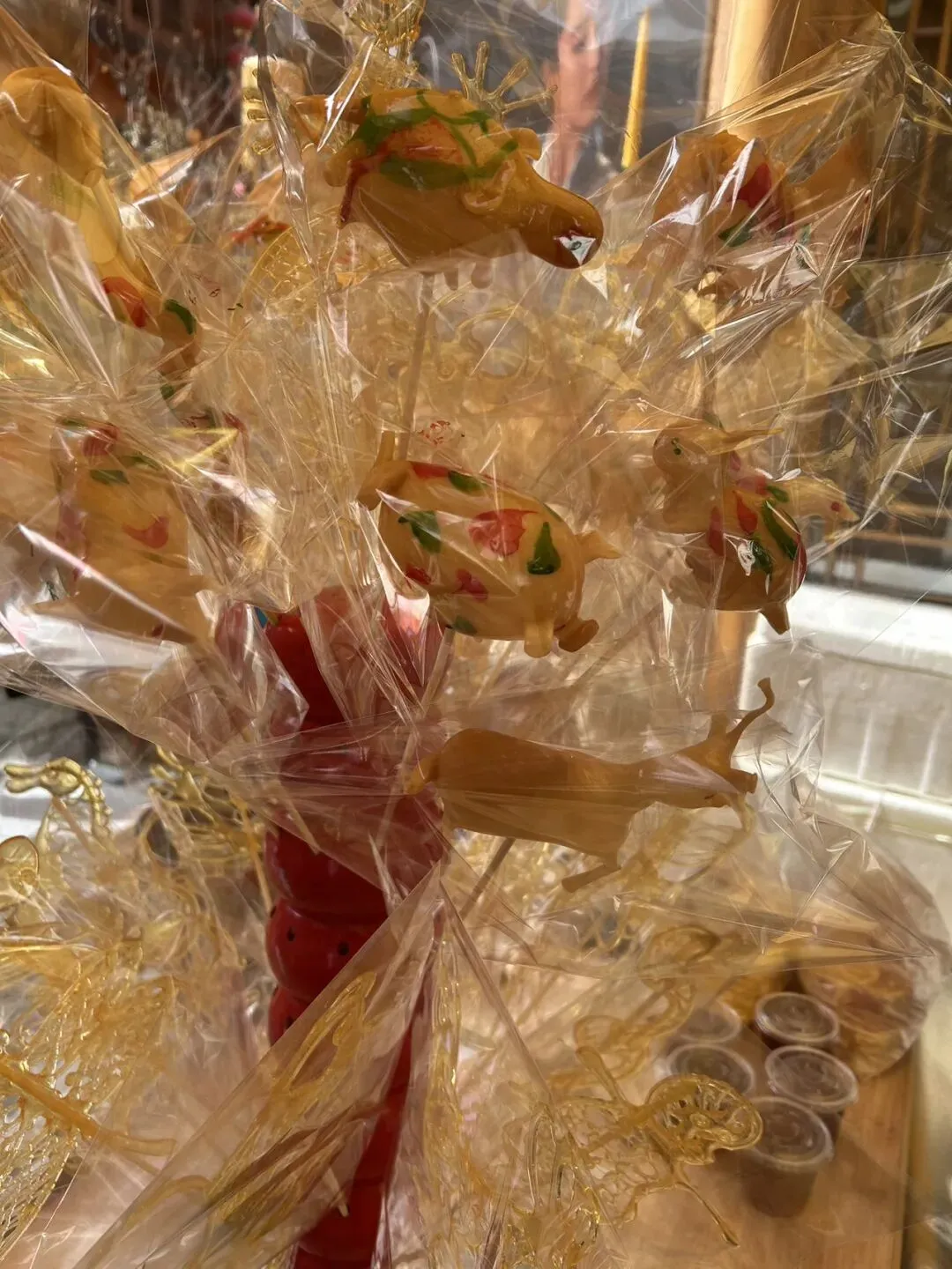 有趣打卡店1:吹糖人店。其实很多小街都有吹糖人,但芜湖这个可以让购买者自己吹。1个30元,小朋友自己属鼠宝宝,于是自己要了一个。大叔协助小朋友做了一只。
