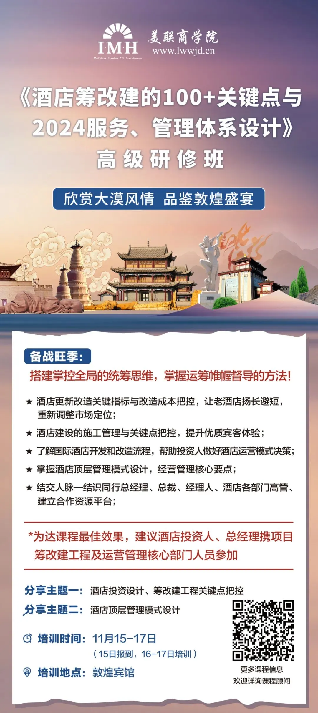 为达到最佳学习提升效果,建议酒店投资人、总经理携项目筹改建工程及运营管理核心部门人员参加。
