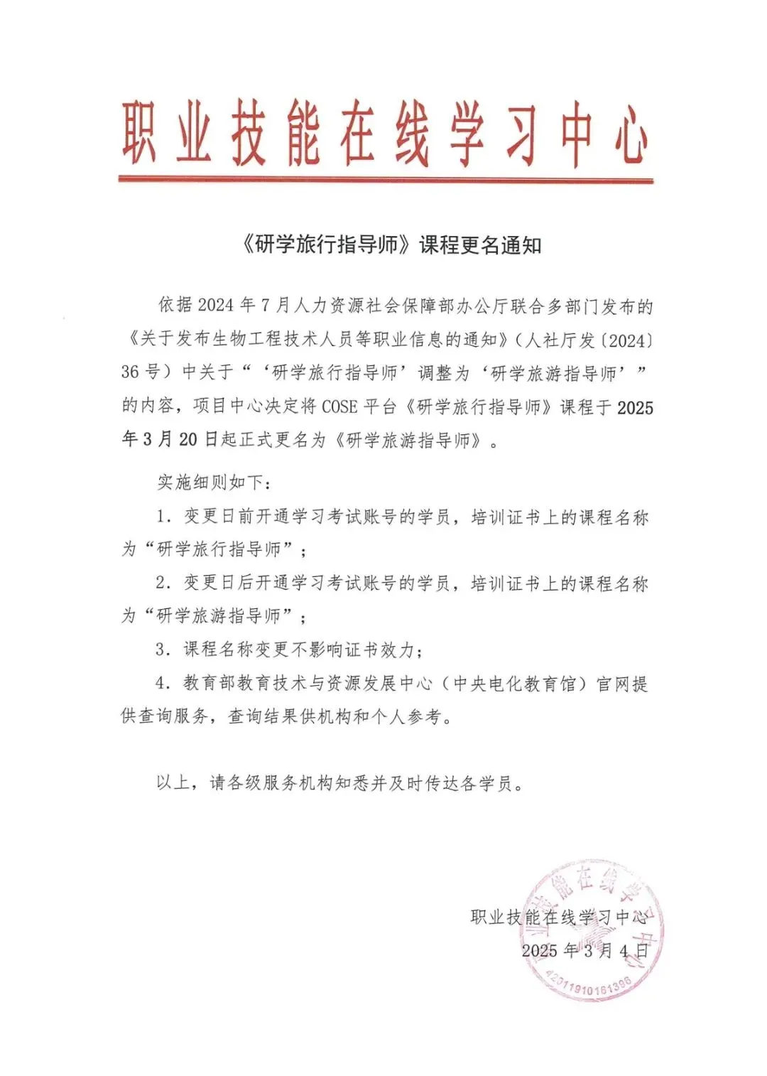 2.变更日后开通学习考试账号的学员,培训证书上的课程名称为“研学旅游指导师”;