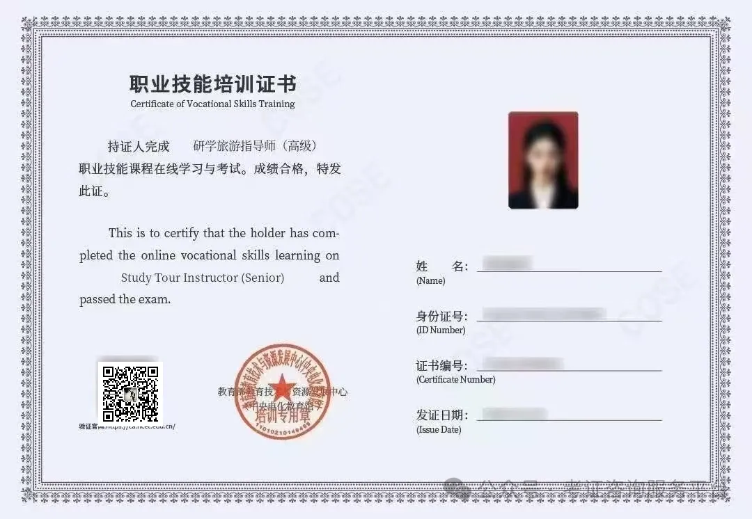 学习完毕通过考试者,可获得由国家教育部中央电化教育馆颁发的《研学旅游指导师》高级证书,证书编号唯一,可在教育部中央电化教育馆官网查询。含金量高。