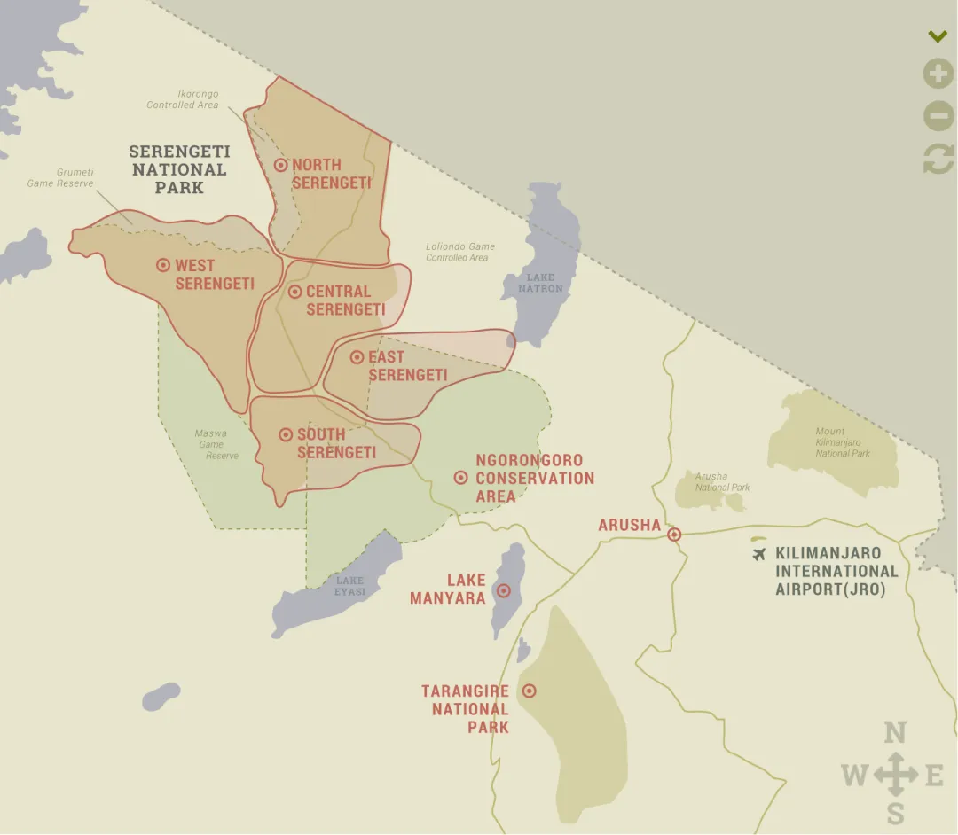 中部则是以塞罗内拉河谷(Seronera Valley)为核心,是塞伦盖蒂生态系统的枢纽,拥有公园内最密集的野生动物分布。