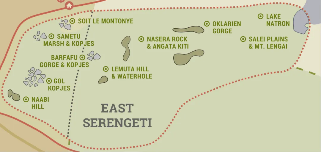 塞伦盖蒂东部以起伏的丘陵、花岗岩露头(Kopjes)和金合欢林地为主,东部边界与洛利翁多狩猎区接壤。
