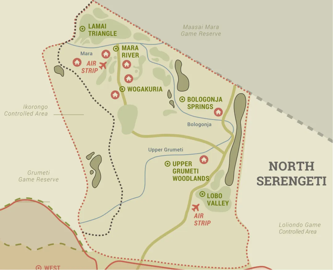 北部以马拉河为界与肯尼亚马赛马拉国家保护区相连,动物世界开头的“天国之渡”(马拉河之渡),便是在于此。