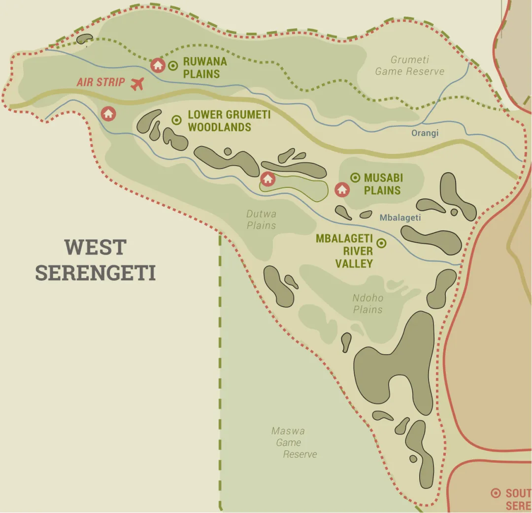 西部是以格鲁美地河(Grumeti River)为轴线,是连接塞伦盖蒂与维多利亚湖的狭长地带,覆盖黑黏土平原和季节性沼泽。
