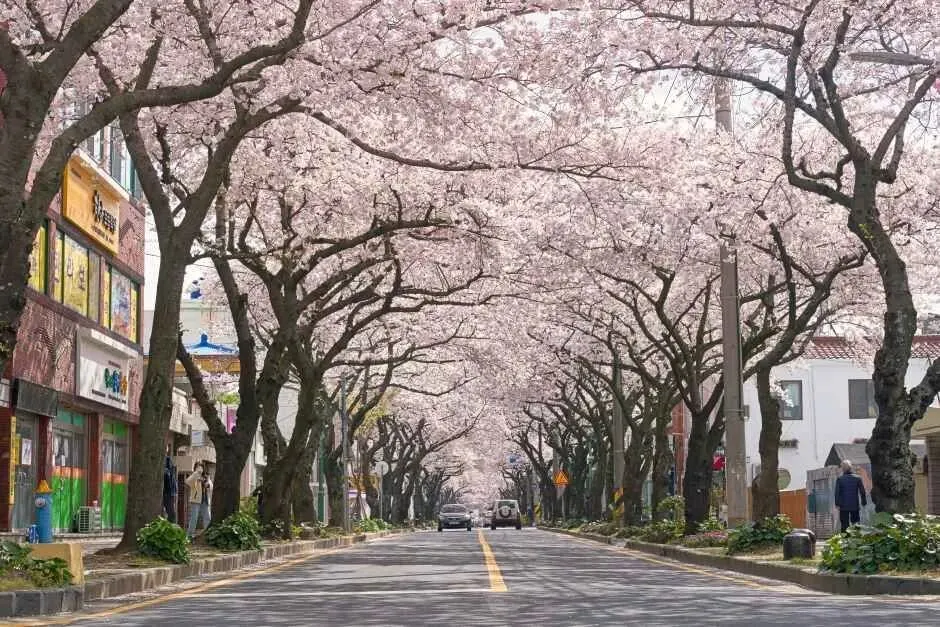 典农路樱花街距离济州国际机场仅约10分钟车程,全长约1.2公里,是济州最具代表性的樱花大道。这里盛开的大樱花原产于济州岛,花瓣比普通樱花更大、更华丽。当盛开的花枝在道路两侧交织时,形成壮观的樱花隧道景观。每年3月下旬的大樱花庆典期间,道路会实施交通管制,游客可以在飘落的花瓣雨中悠闲漫步。