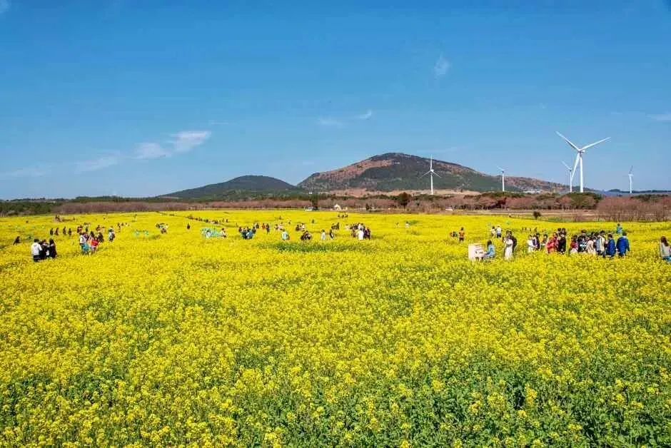 鹿山路全长约10公里,被选为“韩国最美公路100选”之一,是济州岛春季最具代表性的自驾赏花路线。每到3月下旬至4月初,道路两侧金黄色油菜花与淡粉色樱花同时盛开,形成上下交织的春花景观。透过车窗望去,白色风力发电机与花海相映成趣,非常适合春意盎然的旅游照留念。附近的骑马体验公园还会举办西归浦油菜花庆典(2026.04.04~04.05),可结合行程一同游览。
