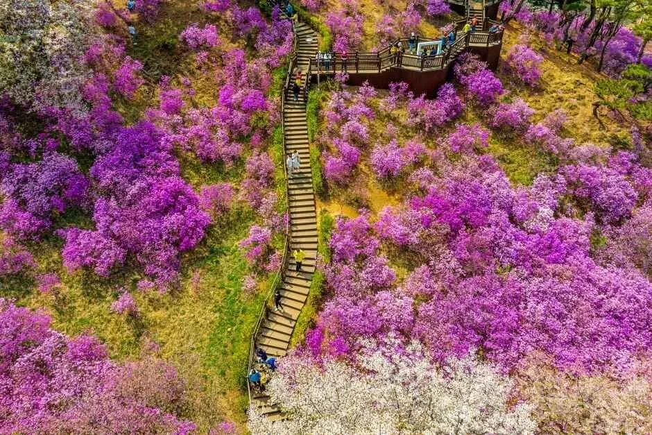 富川杜鹃花山丘位于首尔地铁7号线富川综合运动场站附近,是首都圈规模最大的杜鹃花群落地之一。每到4月上旬,约7万株粉红色杜鹃花铺满海拔167米的远美山山麓,并在此期间举办远美山杜鹃花庆典(2026.04.04~04.05)。这里同时也是富川环山步道1号路线的一部分,步道较为平缓,只需约30分钟的轻松登攀,便能同时欣赏花海并登上山顶。