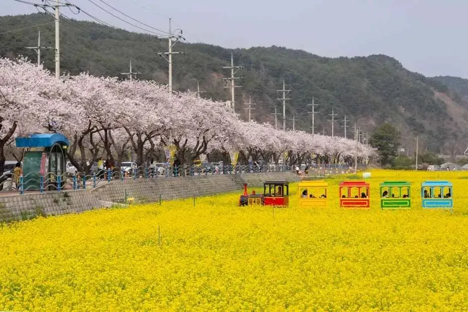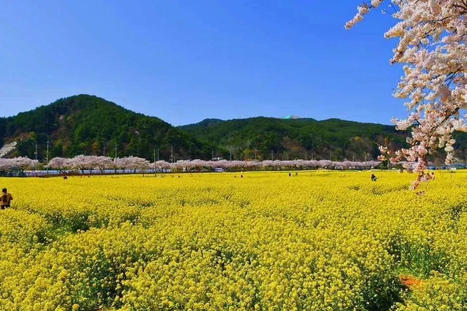 三陟孟芳油菜花村位于BTS《Butter》专辑封面拍摄地孟芳海水浴场附近,是著名的油菜花观赏地。沿着长约2.5公里的樱花大道旁,是面积达6万平方米的广阔油菜花田,其后方则是湛蓝的东海海景,共同构成诗意盎然的春日风光。每年4月举行的三陟孟芳油菜花庆典(2026.04.03~04.19)期间,游客不仅可以参与多种体验活动,还可以悠闲漫步海边。