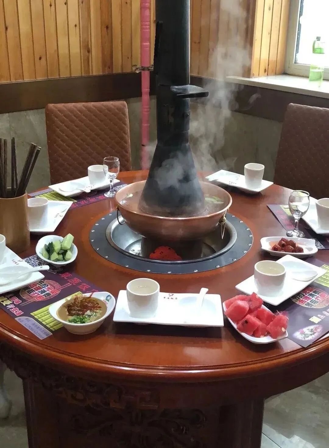 想品尝地道牛羊肉,草原饭店火锅是个不错的选择。外面零下30℃,屋里却是一片火热景象。片好的牛羊肉在盘内整齐堆叠,每一盘分量都很扎实。夹起一片涮入铜锅中,细品之下,满嘴都是肉香。料台上摆满各式调料,可供不同地区的游客自行选择。