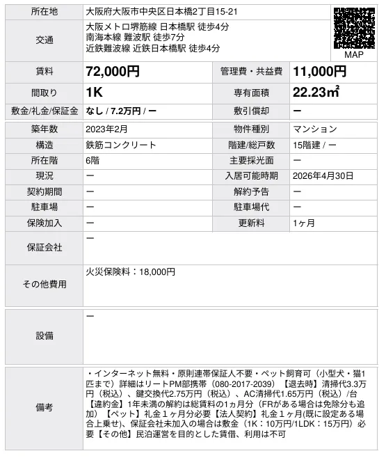 ▪️ 地址:大阪市中央区日本桥2丁目15-21▪️ 价格:7.2万日元 / 月▪️ 管理费:11,000日元▪️ 格局:1K▪️ 面积:22.23㎡▪️ 年份:2023年2月(築浅)