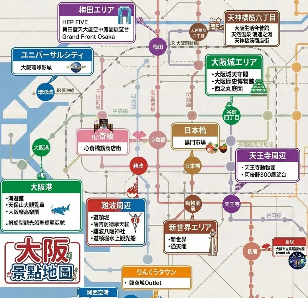 1.购物逛街就去梅田(Yodobashi电器、百货)、心斋桥(Uniqlo、H&M、药妆店、Bic Camera电器)、天王寺(惊安殿堂/唐吉诃德、阿倍野近铁百货)、天神桥筋商店街(生活用品居多)2.寻找在地美食就去----------------------