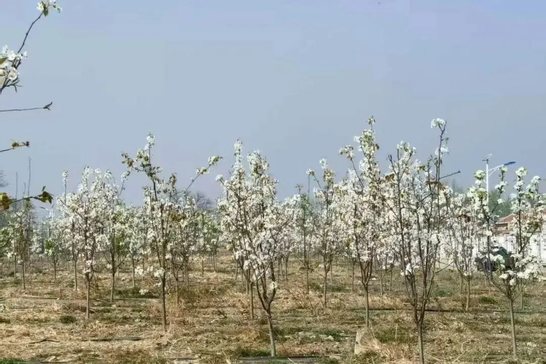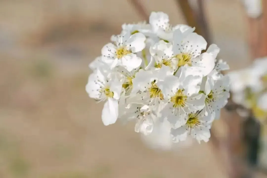 梨花花瓣通体莹白、花蕊淡绿,花型小巧精致,成片梨花林绽放时,如覆一层皑皑白雪,微风过处,花瓣簌簌飘落,素雅清新,与乡野田园相映成趣。