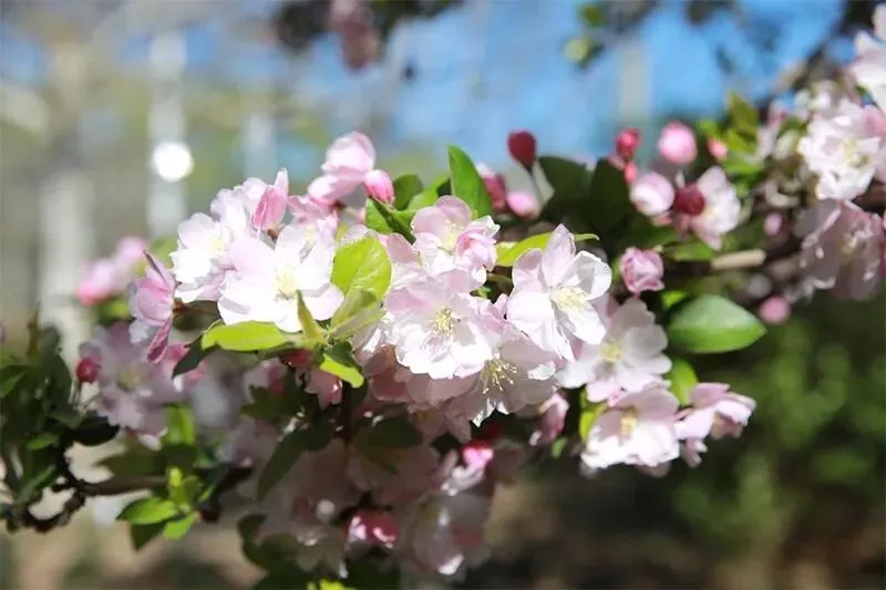 海棠花道的海棠以西府海棠、垂丝海棠为主,西府海棠花型端庄、粉白艳丽,垂丝海棠花枝垂落、花色娇柔,花道两侧海棠盛放,步步生花,与酒店的雅致景观相融,兼具观赏性与氛围感。