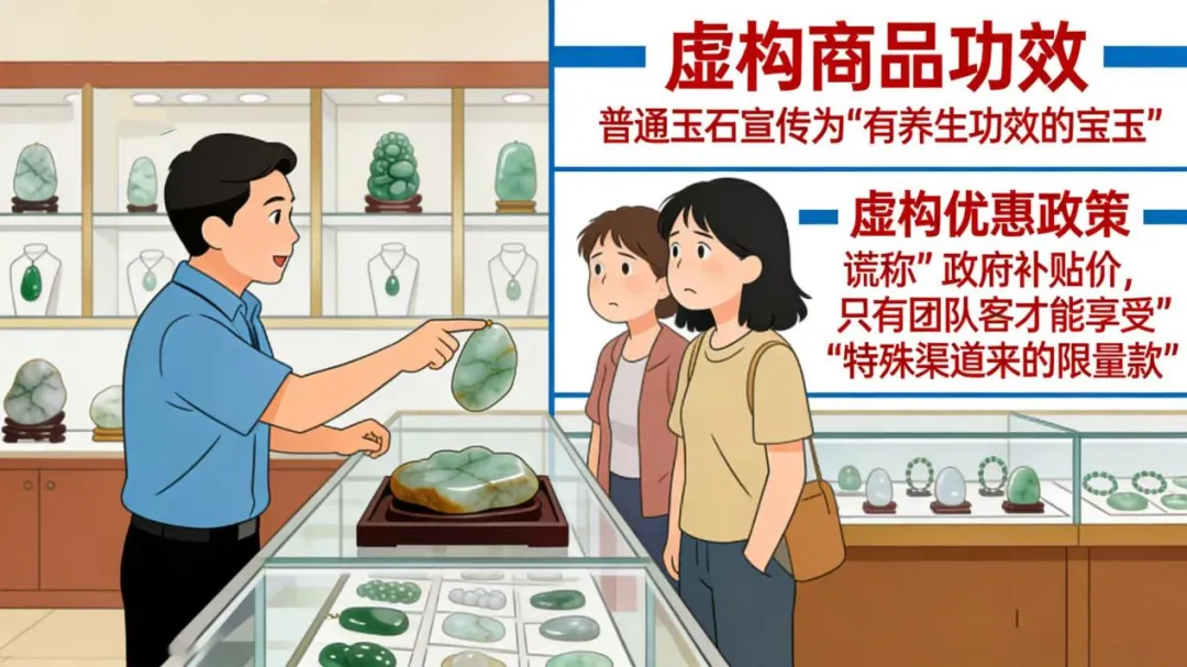 导游往往虚构商品功效,诱骗游客购买质价不符的商品。例如将普通玉石宣传为“有养生功效的宝玉”。还有的会虚构优惠政策,谎称“这是政府补贴价,只有团队客才能享受”“这批商品是特殊渠道来的限量款”。这些行为都涉嫌虚假宣传,违背消费者真实意愿。