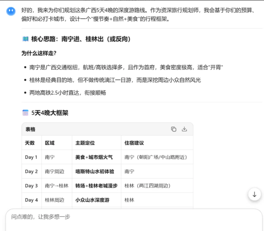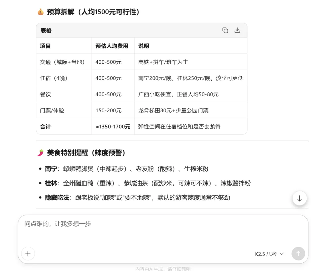 通过清晰的“角色设定+人数+天数+预算+偏好”,Kimi 第一时间锁定了正确的旅行节奏,避免了推荐老年团路线或昂贵的奢华游。