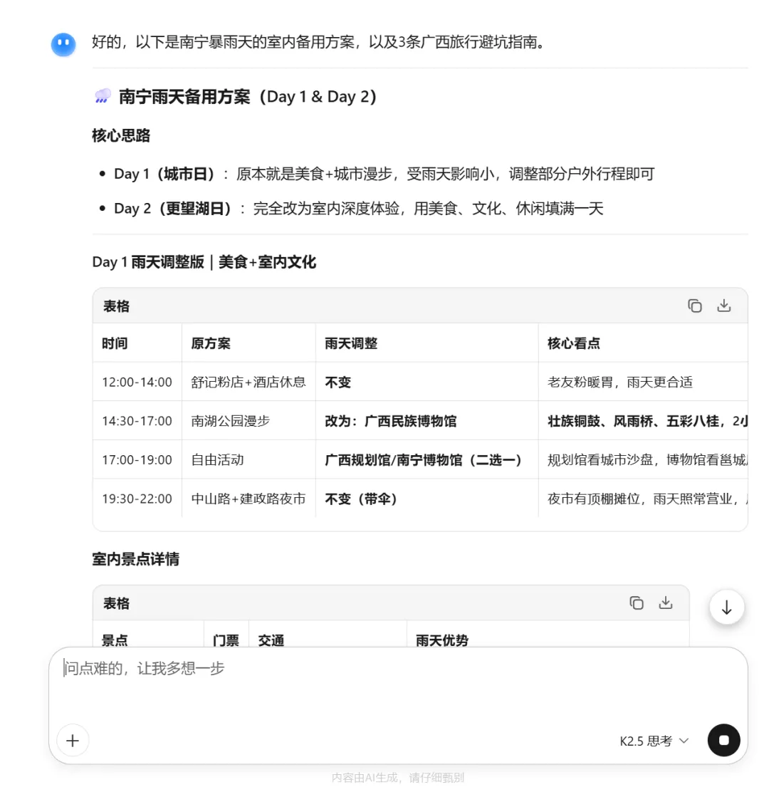 一份好的攻略,除了要好看,还要能“抗风险”。这也是传统搜索做不到,而 Kimi 极擅长的地方。你可以直接让它为你制定避坑和备用方案。