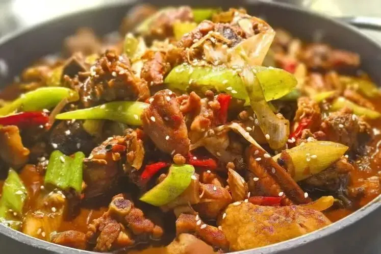除了牛肉汤,机车厂的炒鸡和大盘鸡也是“香”的代名词。整鸡切块,或是带骨鸡腿肉在锅中爆炒与慢炖,被浓郁酱汁层层包裹,甜咸中透出酱香,色泽红亮诱人。鸡肉软烂入味,土豆绵糯吸汁,最后拌入一份手工面或烩面,面条裹满浓稠汤汁,整道菜的精髓,便在这一口里了。