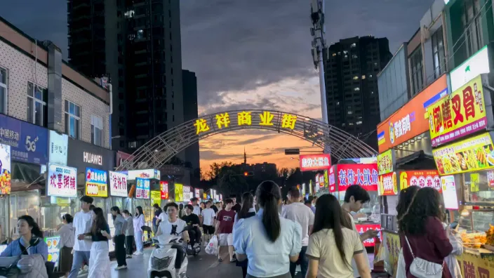龙祥商业街紧邻大学城,几百米的街道挤满了天南地北的小吃。烤冷面、麻辣烫、炒酸奶、炸串……价格亲民,花样翻新快,傍晚时分最是热闹。拎一袋小吃边走边吃,仿佛回到学生时代。