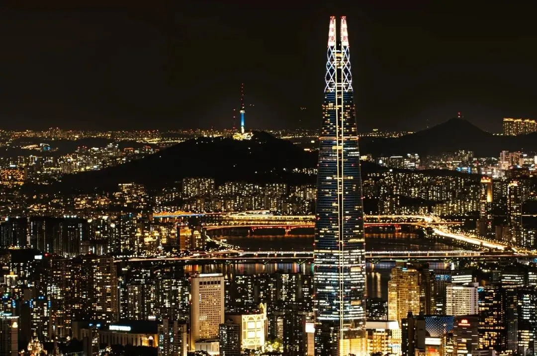 ·石村湖:樱花倒映湖面,乐天世界塔作背景,夜樱绝美