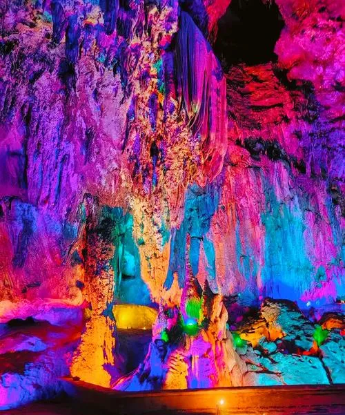 宝晶宫跟连州地下河很多人会拿来比,但这两个地方其实气质完全不同,连州地下河是原始的、粗犷的,宝晶宫是精致的、梦幻的,洞内的灯光设计做得很克制,不是那种五颜六色搞得跟迪厅似的,是用暖色调去突出钟乳石本身的形态,你走进去会觉得这个洞是活的,不是死的景观,因为它的空间层次很丰富,有高达几十米的大厅,也有需要弯腰通过的狭窄通道,这种空间的对比会给人一种探险的感觉,不是被规划好的游览路线,是你在主动发现这个洞穴的秘密。宝晶宫外面还有个天鹅湖,湖水是溶洞里流出来的,清澈见底,这种内外呼应的设计让整个景区变得完整,不是单纯看完洞就走,是在洞内洞外都能感受到山水的存在。