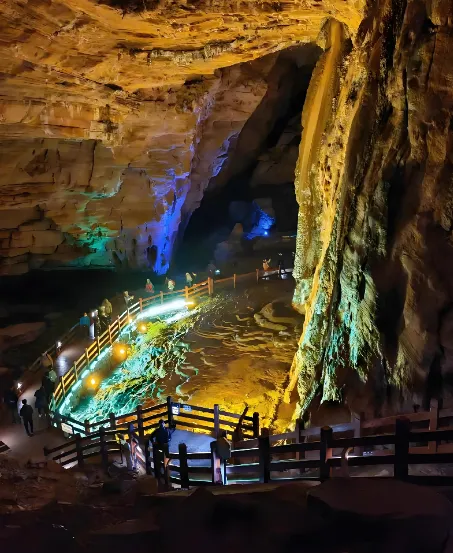 利川的腾龙洞是亚洲第一大溶洞,洞口高74米,宽64米,真的能停直升机!洞里恒温14℃,夏天进去得穿外套。最震撼的是“白玉石林”和地下暗河的轰鸣声。一定要看激光秀和土家歌舞《夷水丽川》,那是在溶洞里演的,效果极其魔幻。