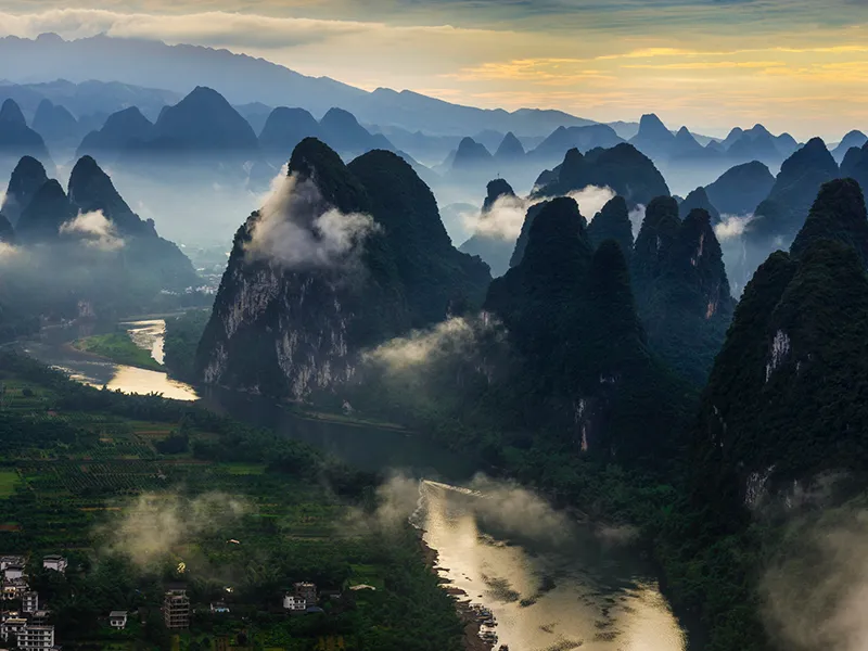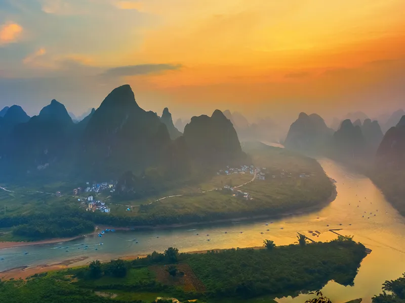 桂林漓江风景区是桂林至阳朔漓江水道两岸83公里的美景,其中最精华的部分,是从启程码头到兴坪的40公里河段。