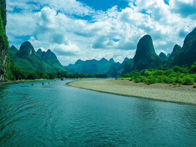 漓江两岸的山峰高耸险峻,形态各异,是桂林风光的精髓。沿途最具代表性的景点有九马画山和黄布倒影,新版20元人民币的背面,就是黄布倒影的美景。