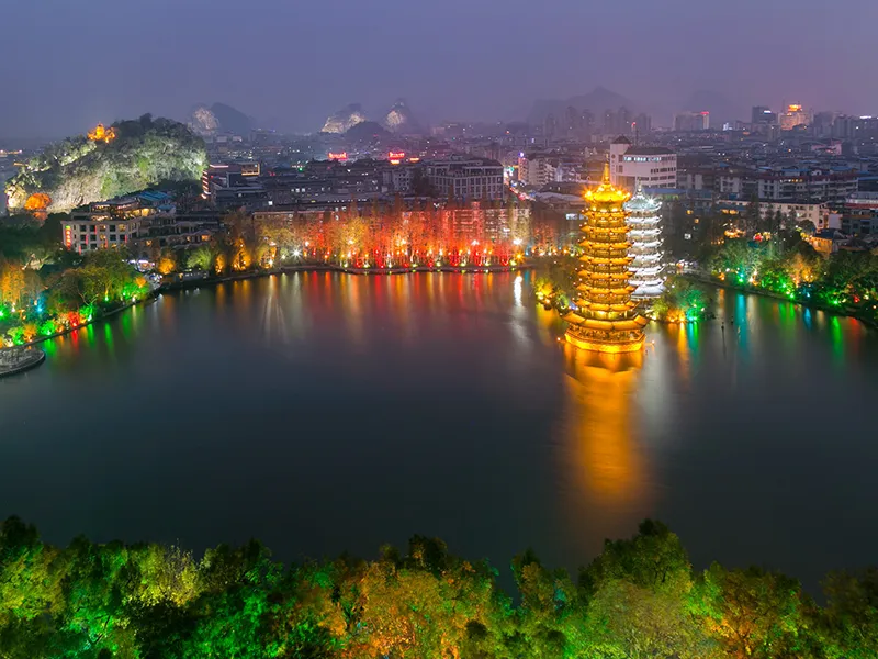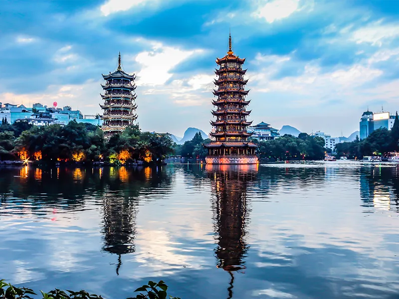 杉湖的日月双塔是桂林的新地标建筑,日塔金光闪耀,是世界上最高的铜塔;月塔玲珑剔透,是用琉璃装饰的。