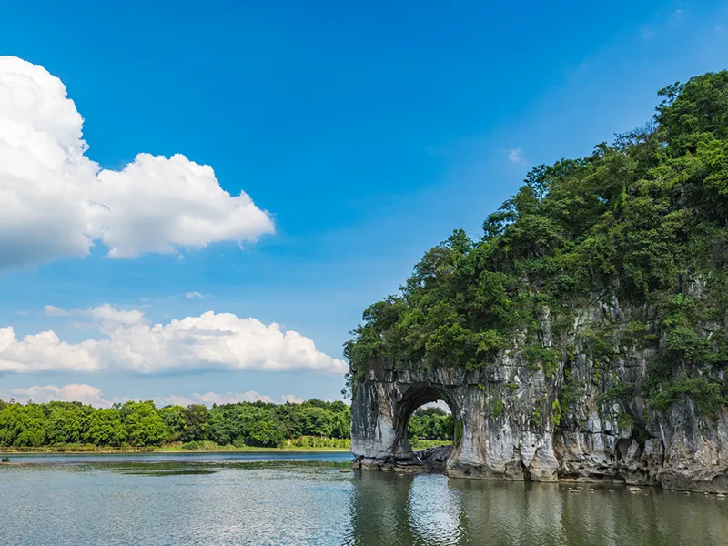 象山景区因有一座像大象一样的象鼻山而闻名,它位于桂林市漓江和桃花江的交汇处,因其奇特的山形和悠久的历史被选为桂林市城徽标志。