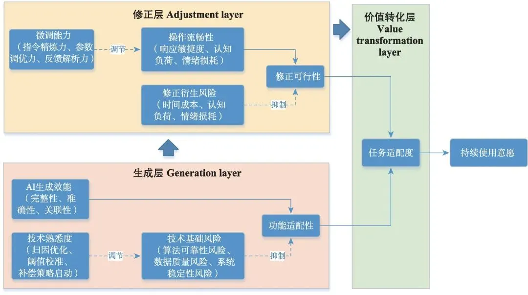 为此,本研究整合人-AI协作理论、任务-技术匹配模型与认知负荷理论,提出生成-修正-价值转化3层动态框架(图1):生成层通过功能适配性设定初始方案的质量门槛,其形成受AI生成效能驱动与技术基础风险抑制;修正层通过修正可行性保障优化行为可持续性,其效能由操作流畅性赋能但受修正衍生风险约束;价值转化层通过任务适配度整合双维输出(功能适配性提供“能修正”基础,修正可行性维持“愿修正”动力),最终中介转化为持续使用意愿。