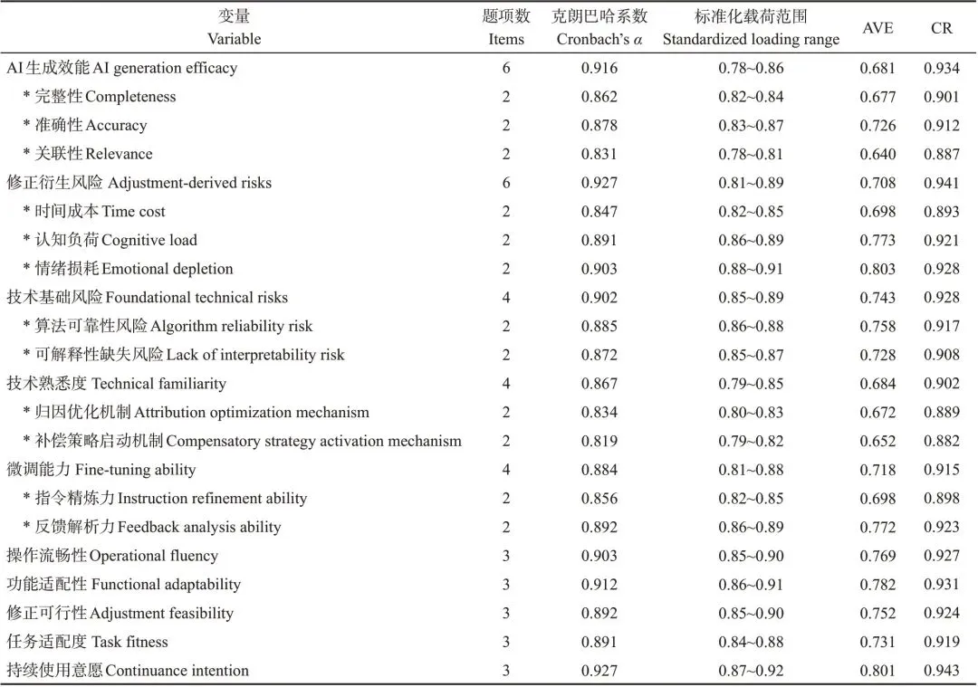测量模型检验结果显示(表2),量表具备优异的信效度特性。首先,所有变量的Cronbach's α系数介于0.819~0.927,表明量表具有高度的内部一致性。其中,修正衍生风险(α=0.927)与持续使用意愿(α=0.927)表现出最优的信度水平,凸显了核心变量的测量稳健性。其次,CFA结果支持显著的收敛效度:所有题项的标准化因子载荷范围在0.78~0.92,平均方差抽取量(average variance extracted,AVE)为0.640~0.803(均>0.5),组合信度(composite reliability,CR)为0.882~0.943(均>0.7)。
