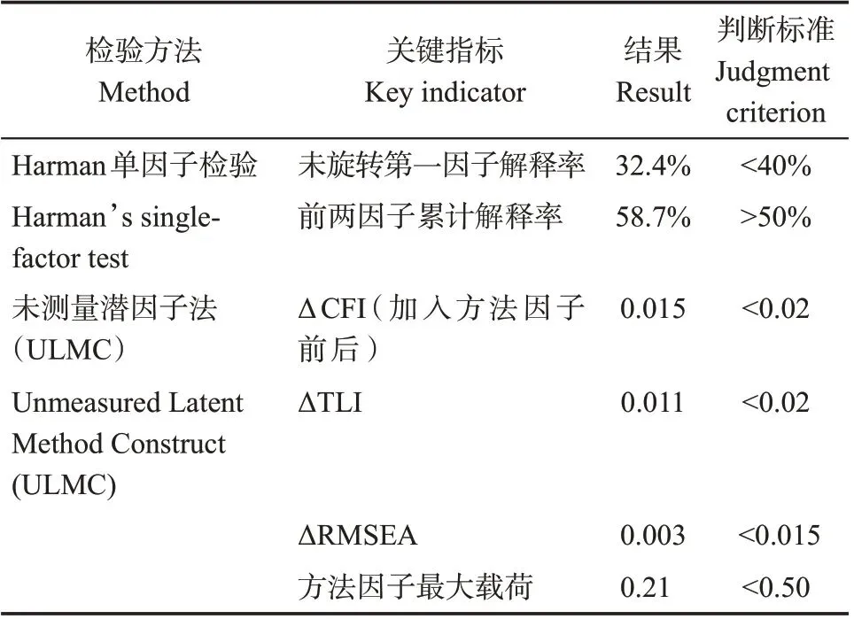 为控制同源偏差,采用三阶段进阶检验策略。首先,进行Harman 单因子检验。所有题项纳入探索性因子分析(exploratory factor analysis,EFA),未旋转解的因子分析结果显示:第一因子解释方差为32.4%(低于40%临界值),前两因子累计解释率达58.7%(超过50%阈值),表明不存在单一方法因子主导问题。其次,未测量潜因子法(unmeasured latent method construct,ULMC)。在验证性因子分析中增加公共方法因子:1)比较拟合指数(comparative fit index,CFI)变化量ΔCFI=0.015(原模型CFI=0.952 →新模型CFI=0.967);2)Tucker-Lewis 指数(Tucker-Lewis index,TLI)变化量ΔTLI=0.011(原模型TLI=0.948 →新模型TLI=0.959);3)近似误差均方根(root mean square error of approximation,RMSEA)变化量ΔRMSEA=0.003(原模型RMSEA=0.047 →新模型RMSEA=0.044),所有变化量均低于 严 格 阈 值(ΔCFI<0.02, ΔTLI<0.02, ΔRMSEA<0.015)。第三,方法因子载荷检验。公共方法因子对题项的最大标准化载荷为0.21,显著低于0.50 的临界值。综合3 项证据表明,共同方法偏差处于可接受水平(表4)。