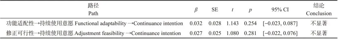 为确保中介机制结论的严谨性,本研究补充检验了功能适配性/修正可行性对持续使用意愿的直接效应,以明确任务适配度在传导路径中的中介性质(表8)。检验结果显示,两条直接路径均未达显著水平(p 值均>0.05),而间接效应显著且效应占比均超85%,证实任务适配度是唯一传导通道,用户对AI功能匹配性和修改便捷性的认知必须经由任务场景适用性评估,才能转化为持续使用决策。